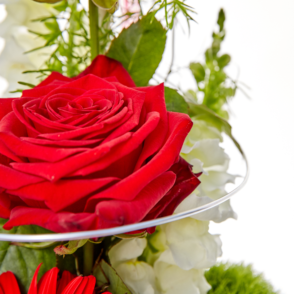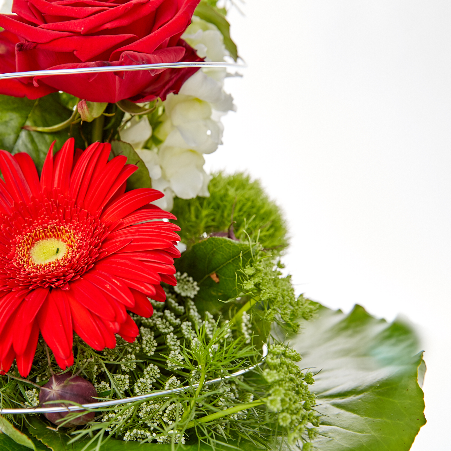 Mit diesem gestaffelten Blumenstrauß schicken Sie besonders edle romantische Grüße an Ihre Liebsten: Zartes Grün umschließt rote Rosen und rote Gerbera, weiße Stäbe und Silberdraht setzen besondere Akzente.